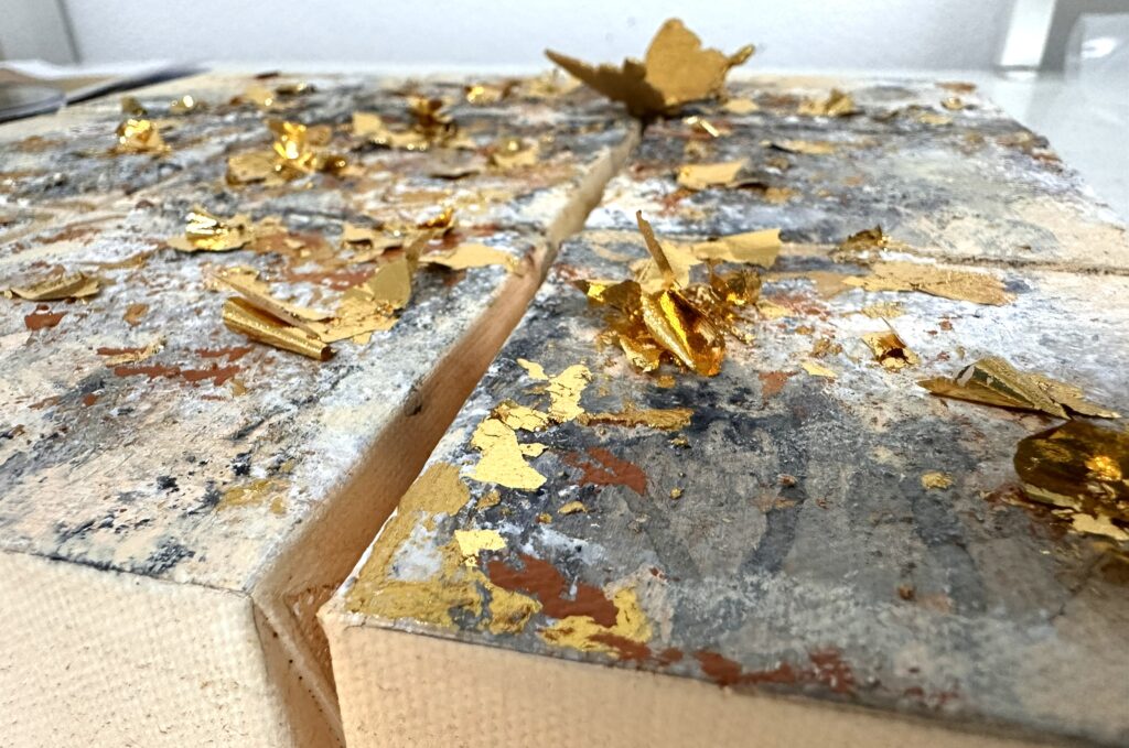 Goldregen 25 x 25 cm auf Leinwänden zu je 8 x 8cm, 5cm Acrylmalerei und Blattgold Share: Twitter Facebook Google+ abstrakt, acrylmalerei, gold, gold, blattgold, Leinwand